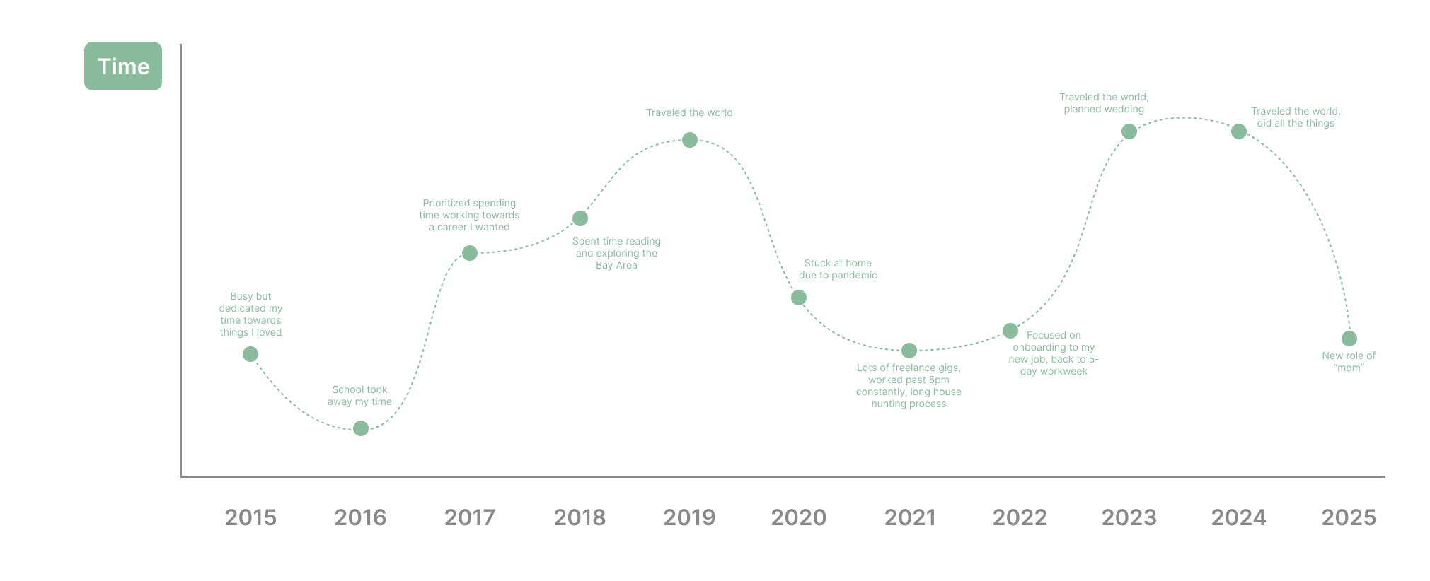 Reflecting back, there is an inverse relationship between time and financial wealth, especially during early adulthood when finances can’t yet be leveraged. (More on this later.) I also noticed that the eras when I have most control over my time were the years I was happiest. This year, as Simon and I become parents, I’m choosing to sacrifice my time over the next however many years to build something more meaningful.